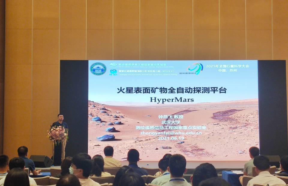 我组老师钟燕飞,博士生宋蜜,硕士生赵之若,本科生周雯参加了此次大会,与专家学者进行了密切交流。钟燕飞教授在大会上作题为《火星表面矿物全自动探测平台HyperMars》的报告,硕士生赵之若作poster展示,同与会代表进行了密切交流。