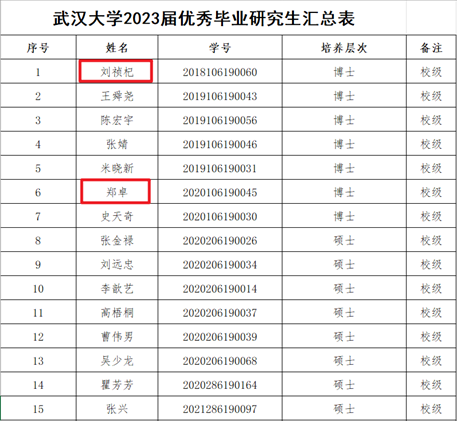 为营造积极向上的校园文化,表彰和奖励德智体美劳全面发展且表现突出的优秀毕业研究生,充分发挥先进典型的示范、激励和引领作用,武汉大学在2023届毕业研究生中开展优秀毕业研究生评选。