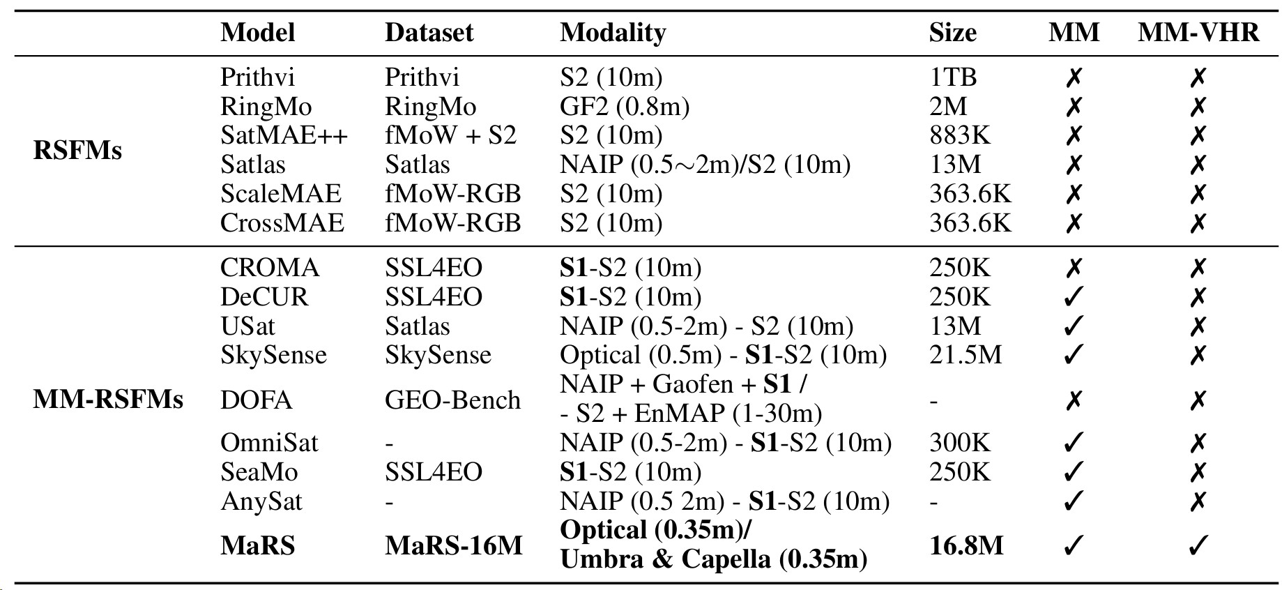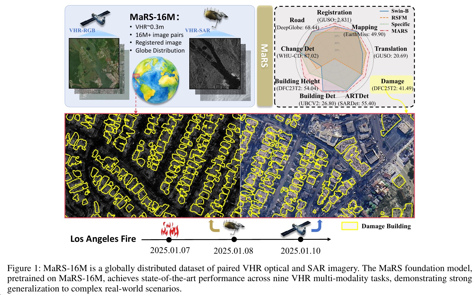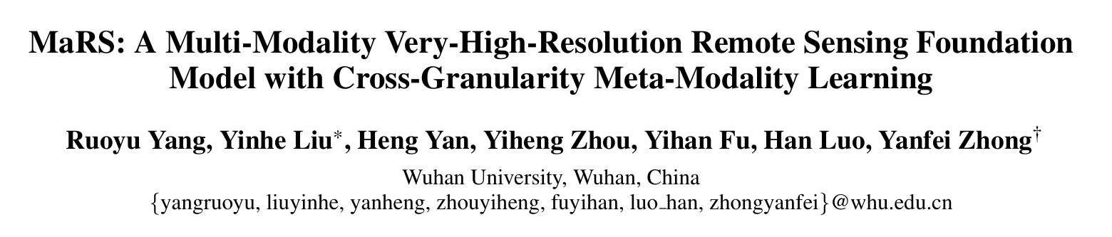 论文标题:MaRS: A Multi-Modality Very-High-Resolution Remote Sensing Foundation Model with Cross-Granularity Meta-Modality Learning 项目网站:https://rsidea.whu.edu.cn/mars.htm 论文:https://rsidea.whu.edu.cn/mars.pdf 代码:https://github.com/WanderRainy/MaRS 收录会议:AAAI 2026 研究背景 现有一些遥感基础模型 (RSFMs) 通常聚焦在 多模态但 中低分辨率数据,如谷歌的AlphaEarth和武大的Skysense++,或 单模态 + 高分辨率 (通常为光学图像),如Meta的DINOv3。而对于高分辨率 (VHR) + 多模态 (光学 + SAR) 的场景,缺乏大规模、配对良好、系统性的数据集和强通用 model backbone。 在诸如城市、灾害、复杂地形、混合地表覆盖 (urban / rural / forest / water / disaster-affect zones) 等实际遥感应用场景中,仅依赖单一模态 (例如光学) 往往无法获得完整的信息 —— SAR 可以补充光学在阴影、夜间、天气不佳、云雾等条件下的观测能力。类似地,仅有中低分辨率、多模态数据在细节级 (sub-meter 级) 的识别能力也不足。 这些环境使得传统模型“难以直接利用”。 因此,迫切需要构建一个 大规模、高分辨率、全球分布、光学-SAR 配对 (paired) 的多模态遥感数据集,并基于此训练一个 通用 (multi-task)、能够对多种地物 / 地表 /灾害 /变化进行理解和分析 的基础模型 (foundation model)。 MaRS 就是在这样的背景 / 动机下被提出。