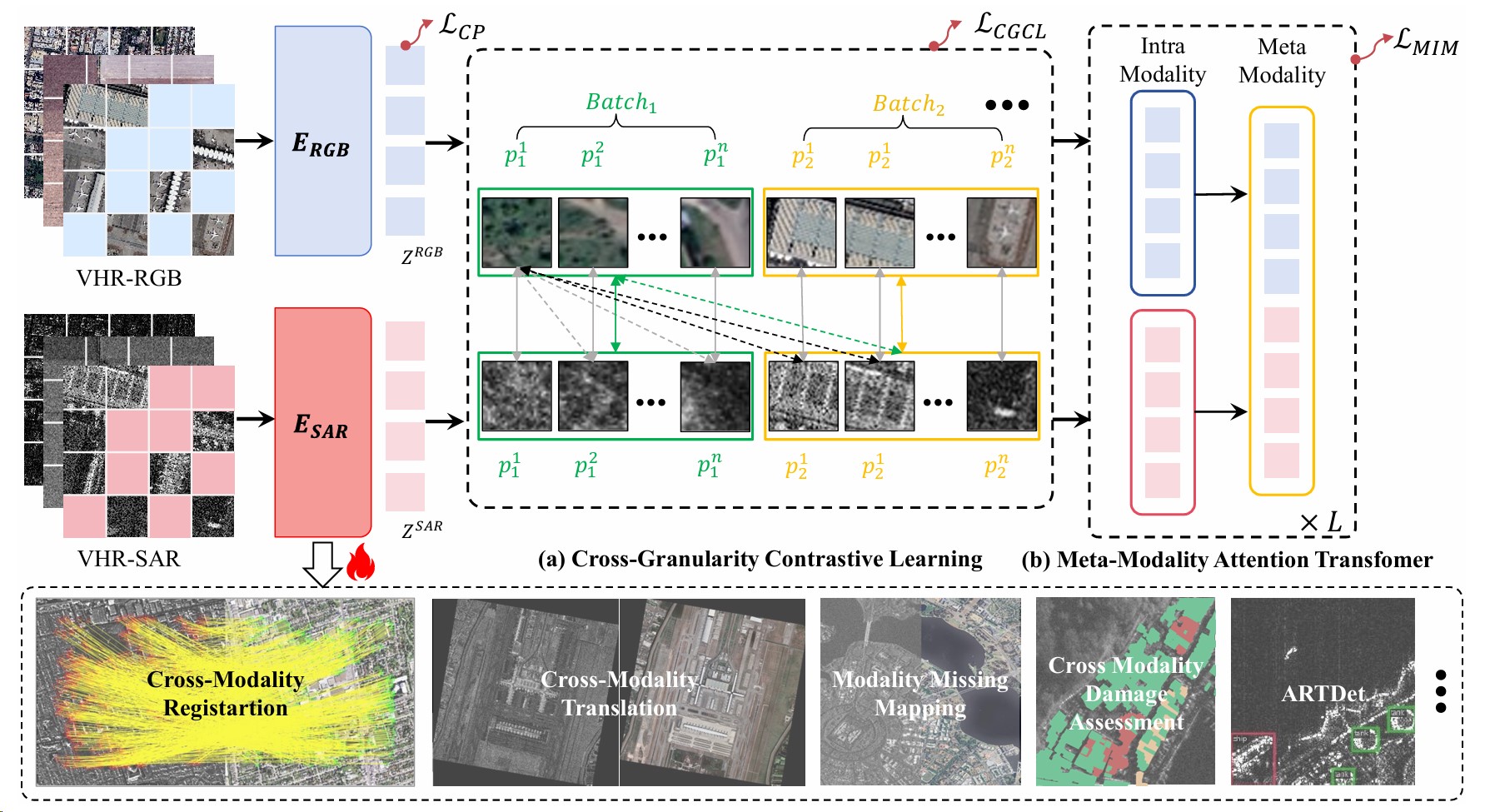 双编码器 + 融合架构 (Dual-Encoder + Meta Modality Attention, MMA) — MaRS 对光学 (RGB/optical) 与 SAR 分别用两个编码器 (基于 SwinV2) 提取各自模态特征,再通过 MMA 模块 (交替进行同模态注意力 + 跨模态注意力) 将它们融合到统一特征空间,实现异模态特征的对齐与融合,缓解物理成像机制差异。 Cross Granularity Contrastive Learning (CGCL) — 为了解决 VHR 遥感图像中 patch-level (局部) 与 image-level (整体) 语义 / 几何 对齐不一致的问题,MaRS 提出 CGCL,将局部 (patch) 与全局 (image) 语义 / 表征进行对比学习,使模型能够兼顾细粒度细节与全局语义一致性,从而增强对复杂场景 (特别是细节丰富、边缘混杂、模态差异大的) 的理解能力。