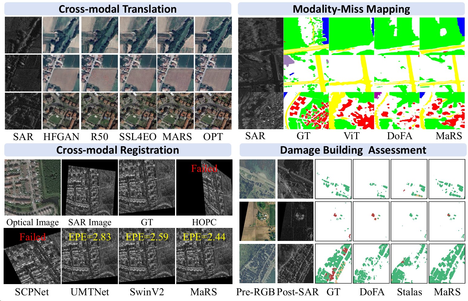 通用预训练 + 多任务适用 (Foundation Model设计) — MaRS 并不是为某个单一任务 (如分割 / 检测) 而构建,而是作为一个 多模态 + 超高分辨率 + 通用 backbone,可迁移到多种下游任务 (配准、模态缺失制图 / mapping、图像翻译 / translation、变化 / 损毁检测、目标检测 / 建筑 /道路 /物体 /高程 /高度估计等) 上。这样的设计大幅降低了为每个任务单独训练模型的重复成本。 性能突破 根据 MaRS 官方结果 (在九类代表性 VHR 多模态任务上),MaRS 展现出强大的性能与泛化能力。部分典型结果如下: 跨模态配准 (Registration):RMSE ≈ 2.83 模态缺失制图 (Modality-Missing Mapping / mapping under missing modality): mIoU ≈ 49.90 跨模态图像翻译 (Translation):PSNR ≈ 20.69 + SSIM 提升 SAR 目标 / 建筑 /物体检测 (Detection / Building Detection): 在标准数据集上达到 mAP ≈ 55.40 (SAR 目标) / mAP ≈ 26.80 (建筑物检测) 建筑高度 / 高程估计:高度误差 Δ ≈ 54.04 变化检测 / 损毁 /灾害评估 (Change / Damage Detection):IoU ≈ 87.02 (optical change detection) 或 IoU ≈ 41.49 (灾害损毁评估) 道路提取 (Road Extraction):IoU ≈ 68.44 (on optical) 此外,MaRS 表现出 对城市 /灾害 /复杂地形 /多源 /多时相数据的良好泛化能力和鲁棒性,其特征表达在物体边缘和细节区域更加清晰 (sharp activations),并且在不同模态 (光学 / SAR) 之间表现出更高的一致性 (modality-invariant representation)。