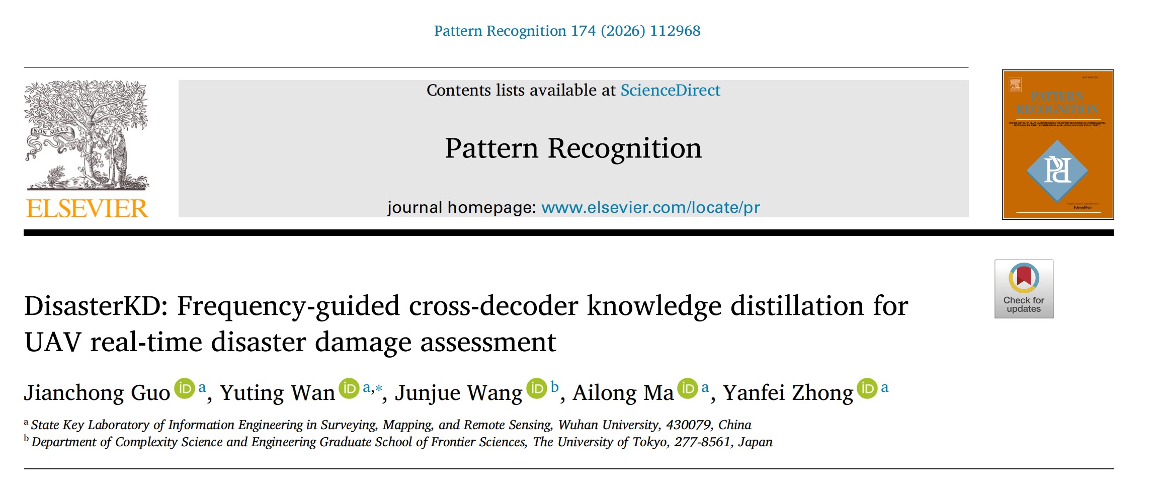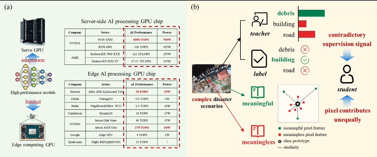 武汉大学测绘遥感信息工程全国重点实验室RSIDEA团队提出了首个面向无人机(UAV)边缘端实时灾害损毁评估的知识蒸馏框架DisasterKD,通过“灾害场景高-低频率引导的知识分解”和“跨解码器知识迁移”两项关键设计,在不增加部署端推理开销的前提下显著提升轻量模型在灾后复杂场景中的分割与损毁评估能力。相关研究成果 “DisasterKD: Frequency-guided cross-decoder knowledge distillation for UAV real-time disaster damage assessment” 发表于国际权威期刊 Pattern Recognition (PR)。武汉大学测绘遥感信息工程全国重点实验室博士生郭鉴翀为第一作者,万瑜廷副教授为通讯作者、钟燕飞教授、马爱龙副教授和东京大学王俊珏博士共同参与完成研究。 代码已开源(https://github.com/SummerTide/DisasterKD.git),欢迎学术用途下载与交流合作。 研究背景 无人机实时遥感灾害损毁评估需要在资源受限的边缘设备上运行轻量级模型,而知识蒸馏是实现模型压缩与端侧部署的有效途径。然而,灾害场景具有显著的复杂性与异质性,灾后影像呈现混乱的视觉模式与不规则的损毁边界,使得传统蒸馏方法难以准确识别并传递对损毁判别最关键的信息。同时,在严重受灾区域,教师模型预测与真实标注之间往往存在不一致,容易引入相互矛盾的监督信号,进而破坏学生模型训练的稳定性并降低知识传递效果。