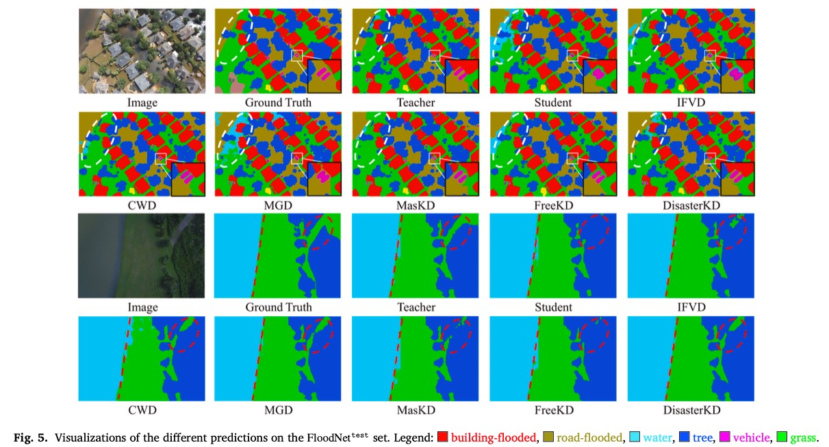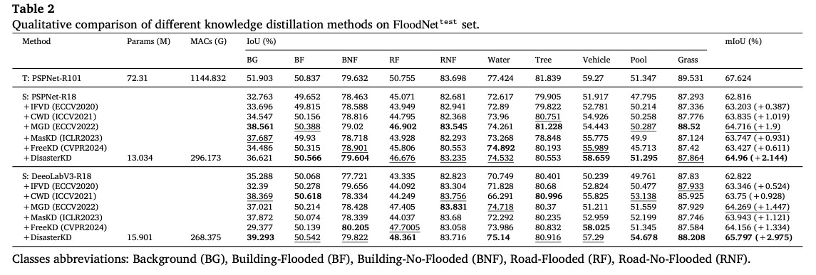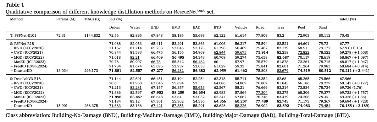 实验验证 在RescueNet和FloodNet两个灾害评估数据集上,DisasterKD显著超越现有知识蒸馏方法,学生网络精度接近教师模型的同时实现了参数量减少超过80%和边缘端推理速度提升约3倍。