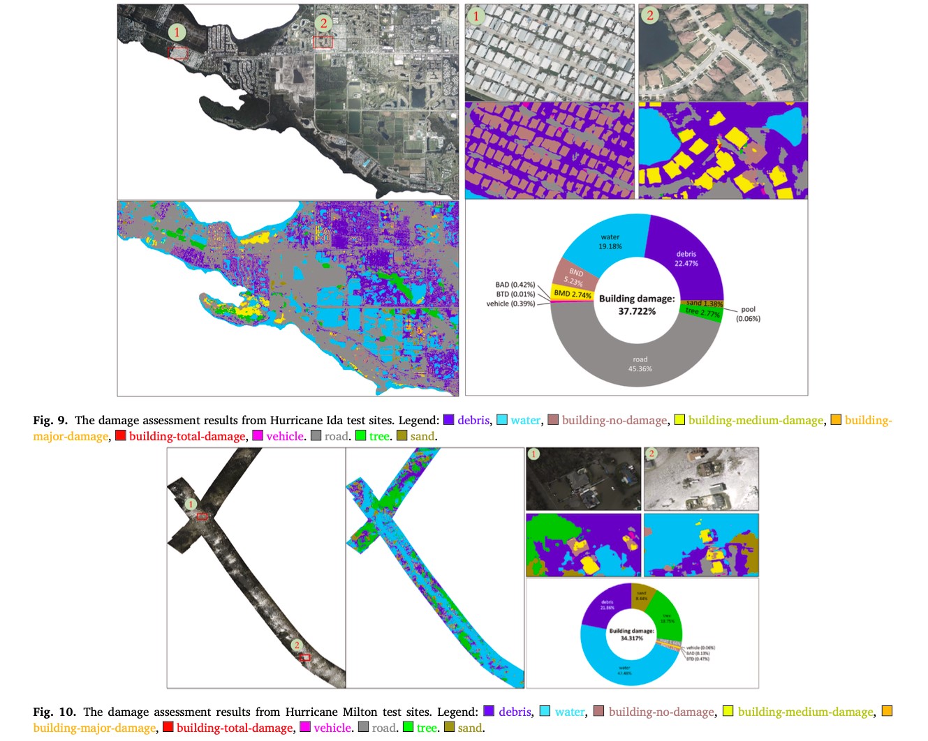 应用研究 在真实飓风灾害场景(Hurricane Ida和Milton)的跨事件测试中,模型成功识别建筑轮廓和基本损毁模式,并在UAV边缘设备(Jetson NX/AGX Orin)上验证了实时处理能力,证明了该框架在应急响应中的实用价值。