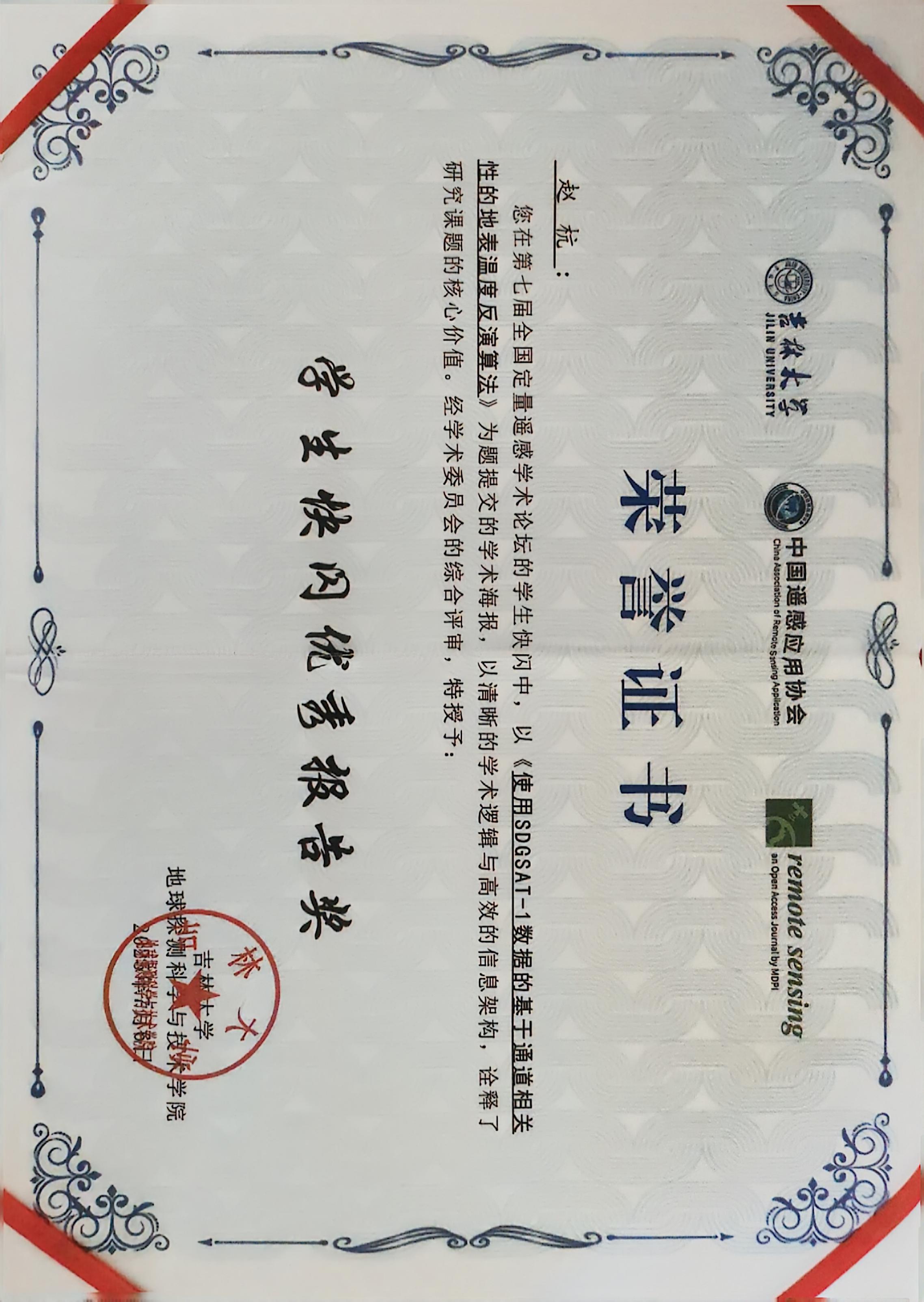 我组雷蕾博士、博士生王宁静、硕士生孔鲁宁、赵杭、杜煜豪、赵安然参加了此次大会,与专家学者进行了密切交流。雷蕾博士在“农业定量遥感”分论坛报告上作题为《历史产品驱动的端到端农作物制图更新方法》的报告,博士生王宁静在“高标准农田与农业设施遥感”分论坛报告上作题为《WHU-RuR:高分遥感影像农村(高标准农田)道路提取基准数据集》的报告,硕士生孔鲁宁在学生快闪报告中作题为《基于珞珈四号01星的多片线性渐变滤光片的宽幅高光谱卫星实验室辐射定标》的报告,硕士生赵杭在学生快闪报告中作题为《使用SDGSAT-1数据的基于通道相关性的地表温度反演算法》的报告,硕士生杜煜豪在“大气环境遥感”分论坛上作题为《GMPE-TEA Dataset: 全球典型能源开采区甲烷点源排放数据集》的报告,硕士生赵安然在“高标准农田与农业设施遥感”分论坛报告上作题为《基于SAM的边界聚焦密集农田地块矢量化网络》的报告,并同与会代表进行了密切交流。硕士生赵杭获学生快闪优秀报告奖。